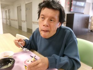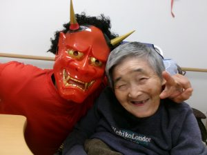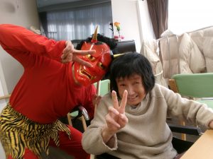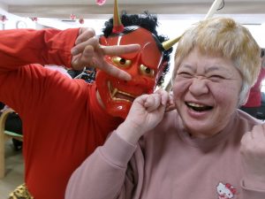 「鬼はこわいな」と開始前は仰っていた利用者の方もいましたが、いざ始まると笑顔で豆まきをしていました。